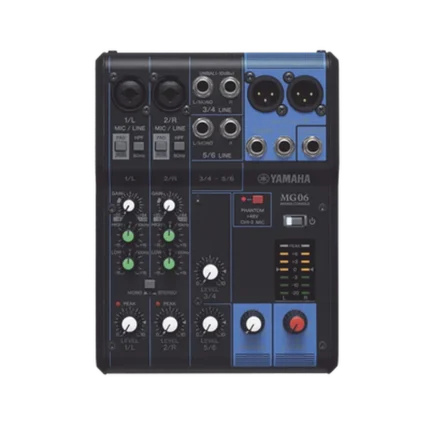Mezcladora de Audio | 6 Canales | 2 entradas de micro/6 de línea (2 mono + 2 estéreo) | Alimentación Phantom