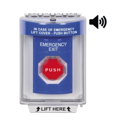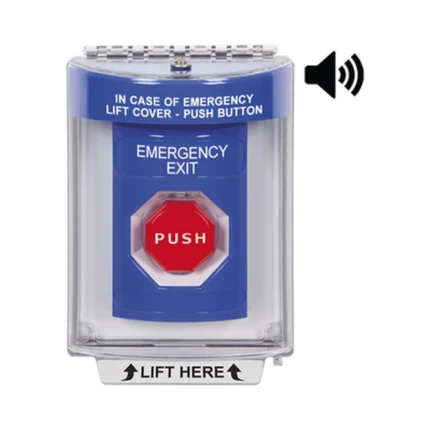 Botón De Salida De Emergencia Con Bocina De Advertencia Integrada, Interior/Exterior, Texto En Ingles, Tapa Protectora De Policarbonato Súper Resistente, Neumático