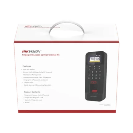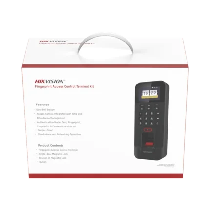 Kit de Control de Acceso TODO INCLUIDO con Lector de Huellas y Tarjetas / 3,000 Huellas / Compatible con App Hik-Connect / Incluye Electroimán Botón de Salida y Montajes Z y L para imán (DS-K1T804)