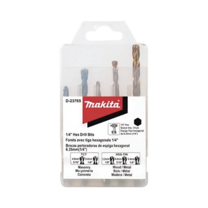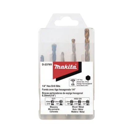 Juego de 5 Brocas con Inserción Hexagonal de 1/4″. De concreto: 3/16″ y 1/4″. Para metal: 1/8″, 3/16″ y 1/4″.