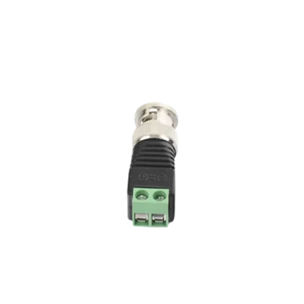 Adaptador de conector BNC macho a 2 terminales-tornillo para cables AWG-26-14, en aplicaciones Video Vigilancia, Níquel/ Oro/ PTFE y PVC.