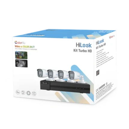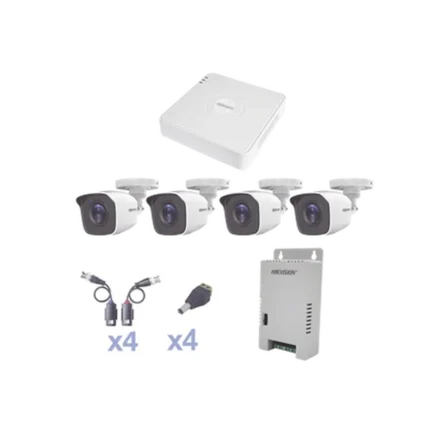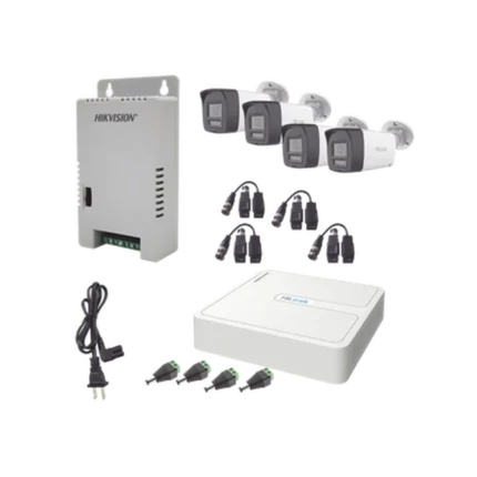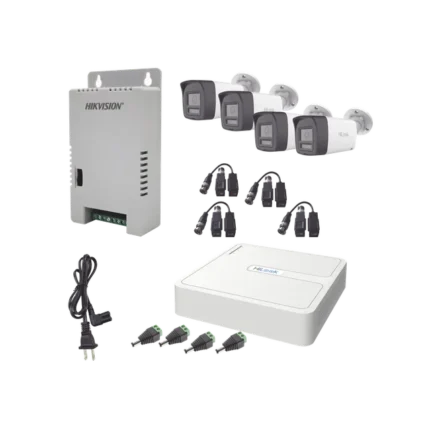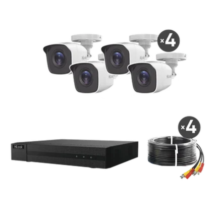 Kit HiLook Audio Bidireccional TurboHD 1080p / DVR 4 Canales / 4 Cámaras Bala (Exterior) con Bocina y Micrófono Integrado / 1 Fuente de Poder / Accesorios