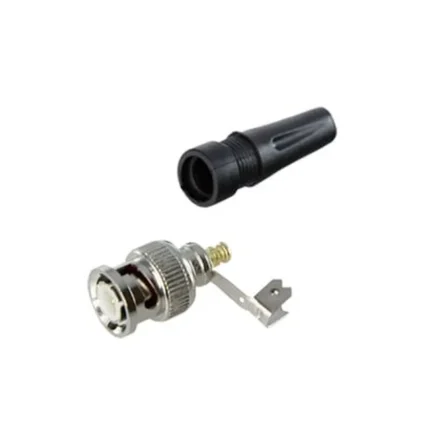 Conector BNC macho en 75 Ohm, para cable coaxial RG-59 / Con base de alivio negra de PVC, Níquel/ Oro/ PTFE.