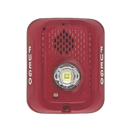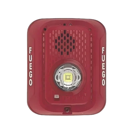 Sirena con Lámpara LED Estroboscópica / a 2 Hilos / Montaje en Pared / 24 Vcd / Configuración Estroboscópica Seleccionable / Texto en Inglés / Color Rojo
