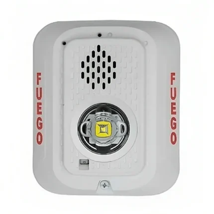 Sirena con Lámpara LED Estroboscópica / a 2 Hilos / Montaje en Pared / 24 Vcd / Configuración Estroboscópica Seleccionable / Texto en Español / Color Blanca