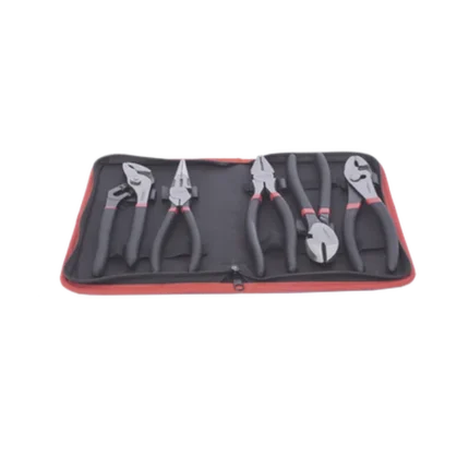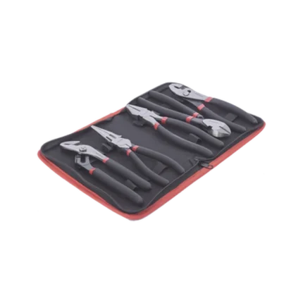 Juego de 5 Pinzas de 8″ con Estuche. Incluye: P. Mecánica, P. para Tubo, P. Eléctrica, P. Corte, Nariz Larga.