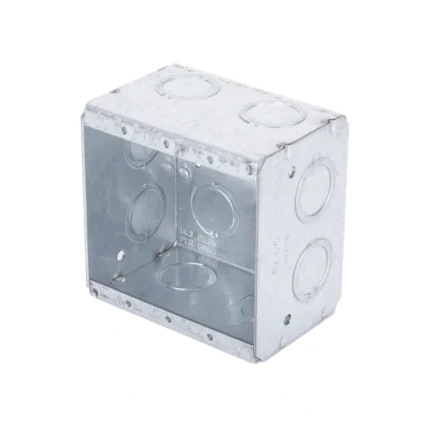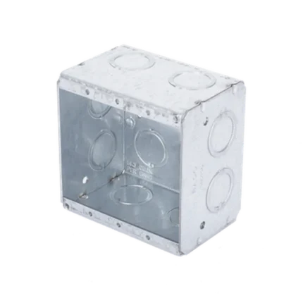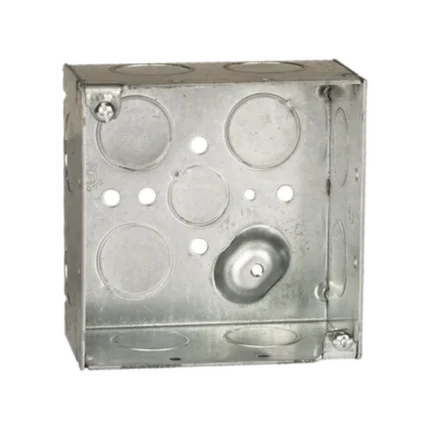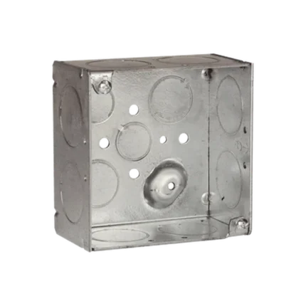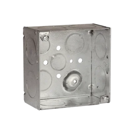 Caja Cuadrada Galvanizada de 4″ x 4″, profundidad de 2 1/8″. Cuenta con 10 KO de 1/2″ y 6 TKO (1/2″ – 3/4″))
