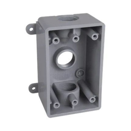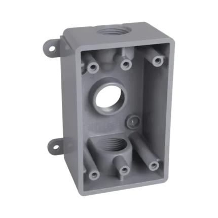 Caja Impermeable de 1 Gang / Profundidad de 2″/ Cuenta con 3 Salidas roscadas para tubería de 1/2″ ó 3/4″/ Color Gris.