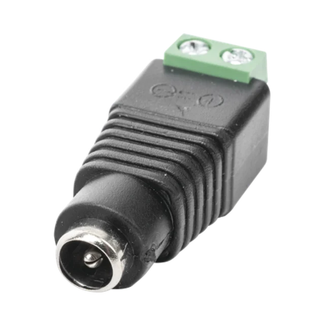 Adaptador tipo jack de 3.5 mm hembra polarizado de 12 Vcc con terminales tipo tornillo.