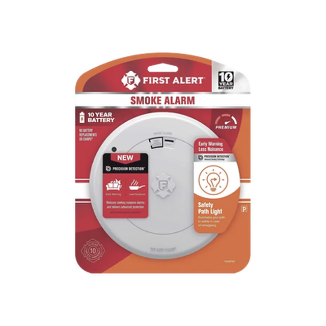 Alarma de Humo First Alert SM210L / Sensor Fotoelectrico / Batería de Litio Sellada de 10 Años / Luz de Seguridad / Rango de Temperatura 4.4°C a 37.8°C/ Cumple UL217, CSFM, NFPA 72, NFPA 101, ICC