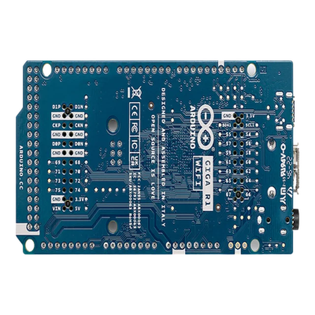 La GIGA R1 WiFi viene con un conector USB-C® para programación, comunicación y funcionalidad HID, un conector USB-A para conectar dispositivos como memorias USB y teclados. Cuenta con un conector de audio de 3,5 mm para conectar altavoces, micrófonos, etc. Los conectores dedicados para cámara y pantalla se encuentran en la parte superior de la placa, que también se pueden conectar desde abajo.