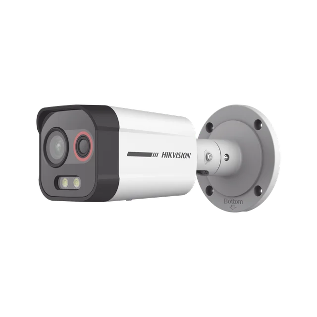 Bala IP Dual / Térmica 1.35 mm (96 x 72) / Óptico 4 mm (4 Megapixel) / Detección de Intrusión por VCA 30 mts /30 mts Luz Blanca / Exterior IP67 / PoE / Sirena y Luz Intermitente Integrada / Micro SD / ColorVu y ACUSENSE