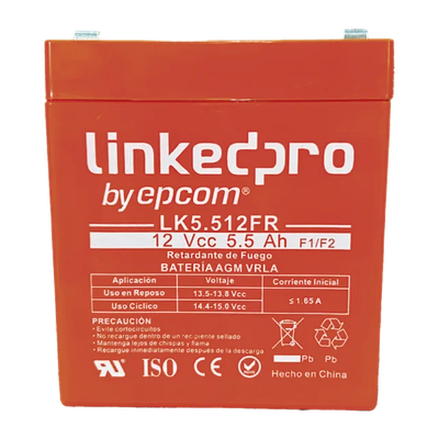 Batería 12 V / 5.5 Ah / UL / Tecnología AGM / Vida útil promedio de 5 años / Retardante a la Flama / Para uso en equipo electrónico, Alarmas de Intrusión / Incendio/ Control de acceso / Video Vigilancia / Incluye