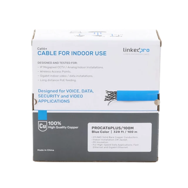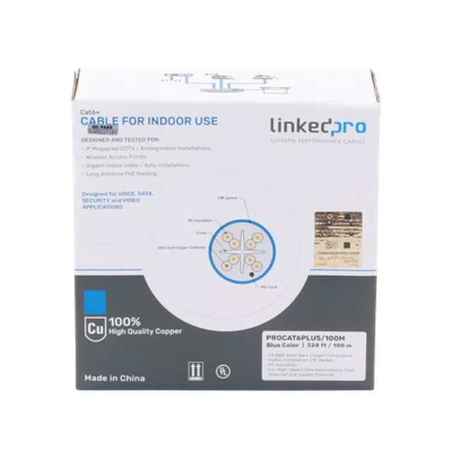 Cable Cat6+ CALIBRE 23 ALTO RENDIMIENTO, ETL,UL, color azul, de 100 metros, super flexible, para aplicaciones de CCTV, video HD, y redes de datos.