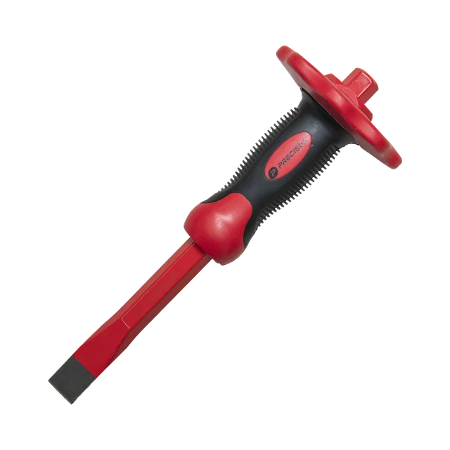 - El cincel de punta plana con protección para las manos es una herramienta imprescindible para trabajos de corte y desbaste en materiales duros como concreto, piedra y metales.