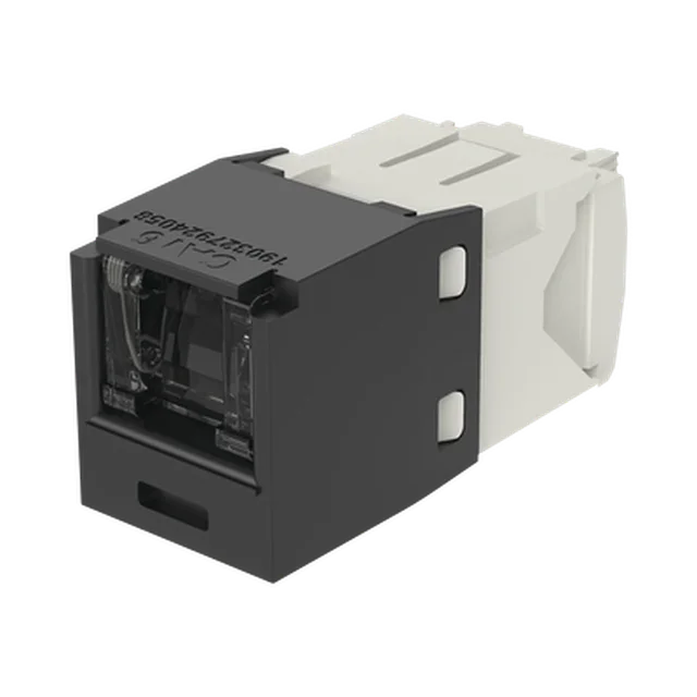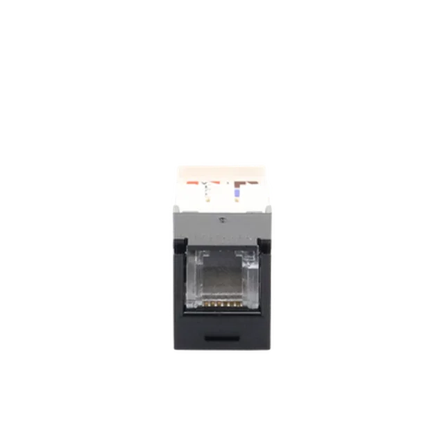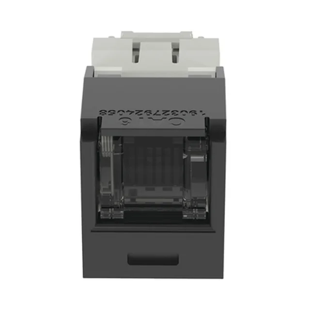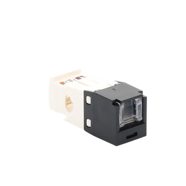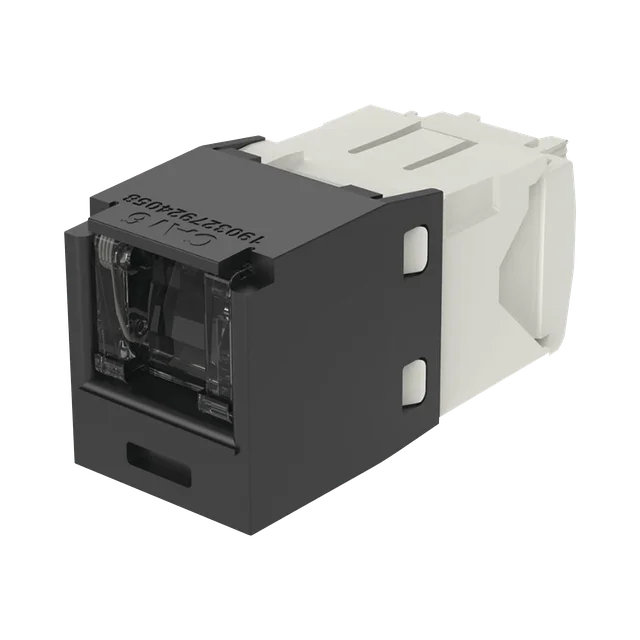 El módulo de conector UTP Categoría 6/Clase E de 8 posiciones, se termina en cable de 4 pares 22 – 26 AWG de par trenzado sin blindaje de 100 ohms y no requiere el uso de una herramienta de impacto. Los módulos de conector UTP usan un método de terminación de movimiento hacia adelante para optimizar el rendimiento al mantener la geometría del par de cables mientras se elimina el destrenzado del conductor. La tapa de terminación esta codificada por color blanco para designar el rendimiento de la Categoría 6 e incluye una etiqueta universal codificada para los esquemas de cableado T568A y T568B.