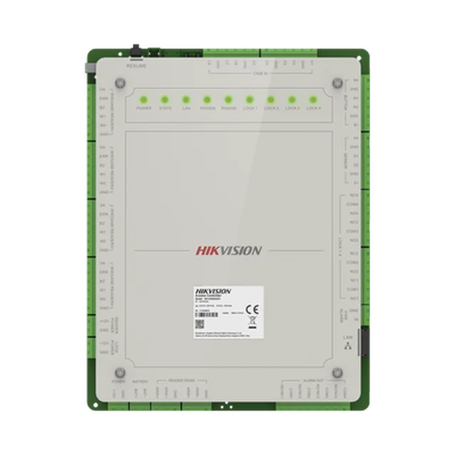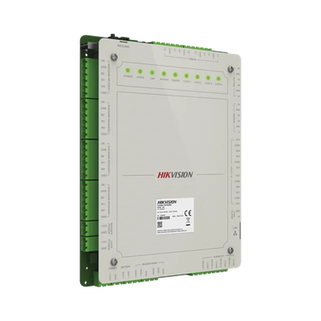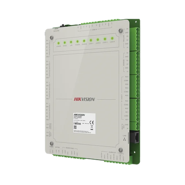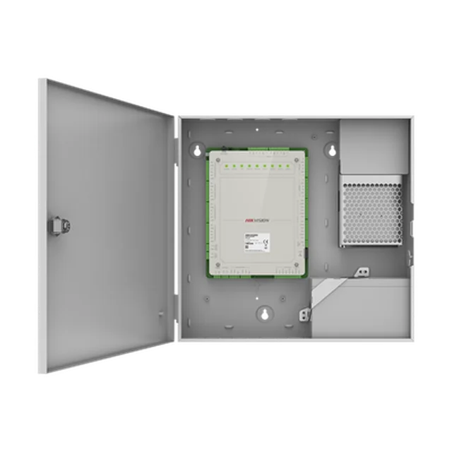 Controlador de Acceso 4 Puertas Administrable en la Nube con Hik-Connect Teams / Interfaz Web / 8 Lectores de Huella o Tarjeta / 100,000 Tarjetas / 10,000 Huellas / Incluye Gabinete y Fuente de Alimentación 12Vcd 8 A / Soporta Batería de Res