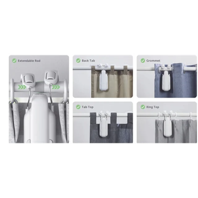 SwitchBot Curtain se puede conectar a una amplia gama de cortinas para ayudarlas a hacerlas inteligentes con una instalación simple de 30 segundos que no requiere herramientas. Después de la instalación, podrá abrir y cerrar sus cortinas automáticamente a través de nuestra aplicación o utilizando horarios para determinar cuándo se abrirán o cerrarán sus cortinas.