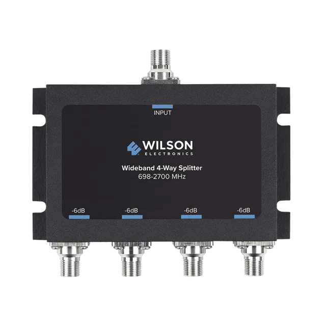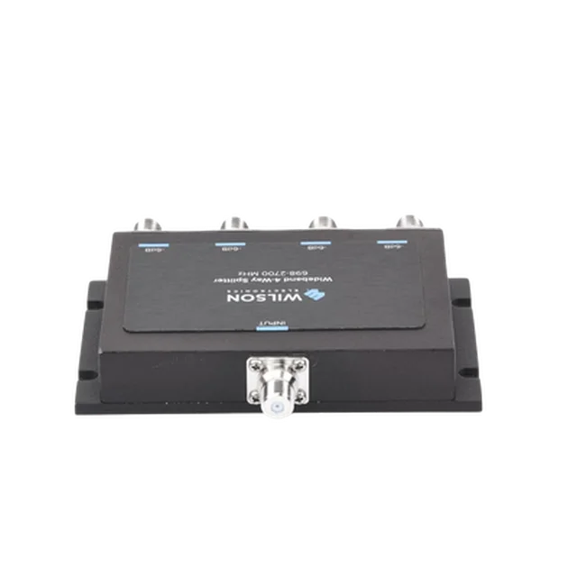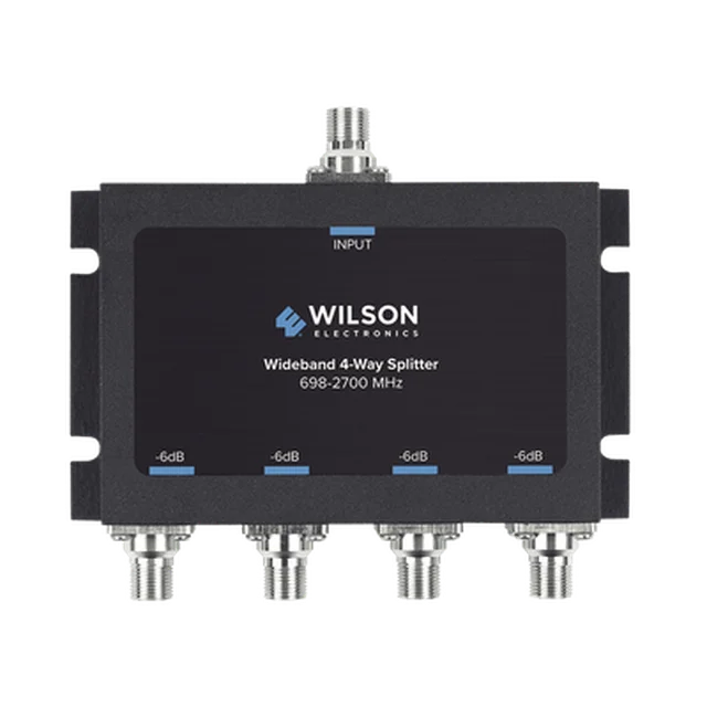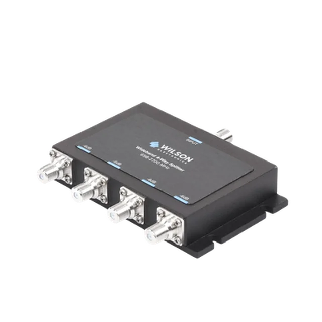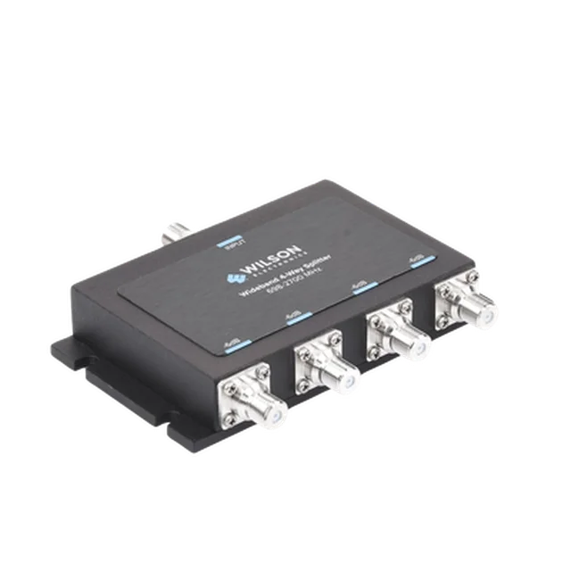 Divisor de potencia de 4 vías para la distribución de señal a dos antenas de servicio | 6 dB de pérdida por puerto | Conectores F hembra