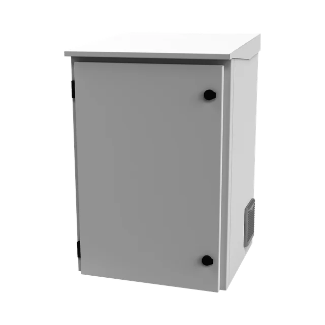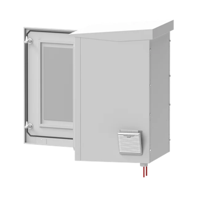 Gabinete para Exterior con Ventiladores y Termostato con Rack de 19″ de 9 Unidades con capacidad de ser instalado en torre, poste o pared.