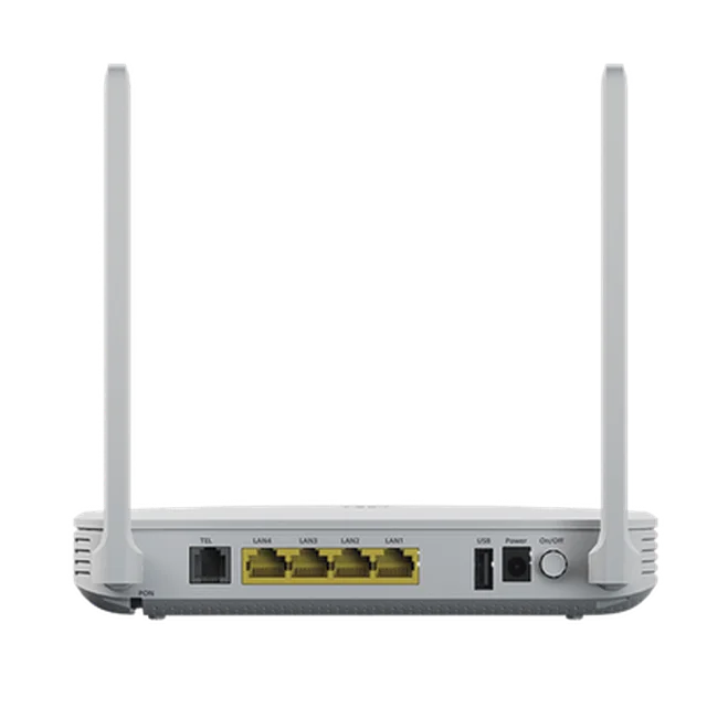 - Puertos:1 puerto GPON, 4 puertos x 10/100/1000 Mbps, 1 puerto POST (FXS) y 1 puerto USB.
