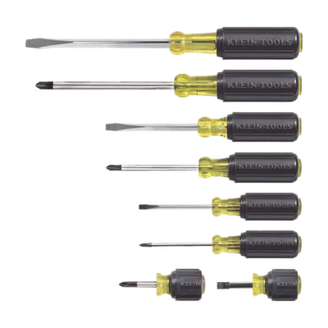 - Juego de 8 desarmadores con mango Cushion-Grip™: 2 de punta plana de 1/4'' (6,4 mm) y 5/16'' (7,9 mm); 2 de punta cabinet de 5/16'' (7,9 mm) y 3/16'' (4,8 mm); tres de punta Phillips n.º 1, n.º 2 y n.º 3; y uno Phillips n.º 2 tipo trompo