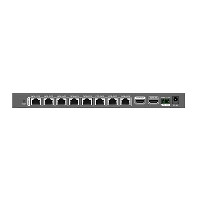 - TX: 1x RS232, 8x Puerto RJ45, 1x HDMI IN, 1x HDMI Out, 1x IR Out, 1x Boton de reset