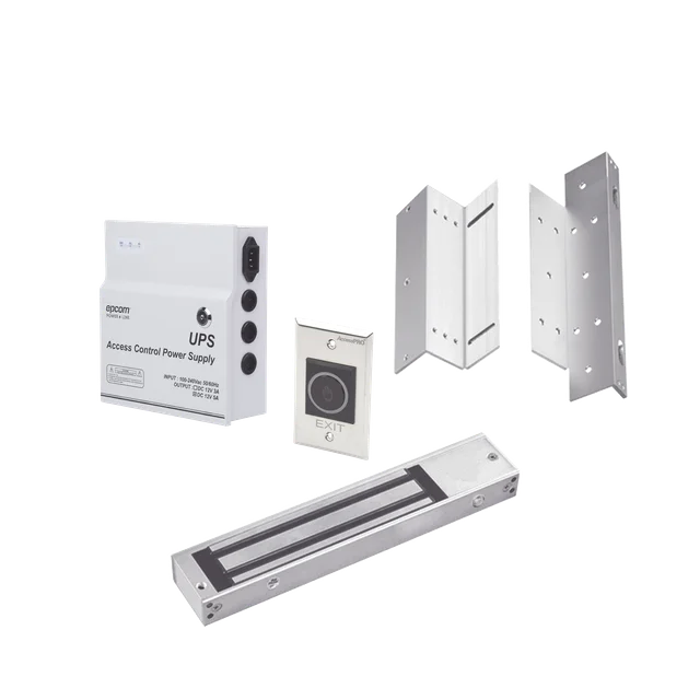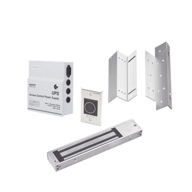 Kit para control de acceso incluye Fuente de 12VCD con respaldo de batería/ Chapa magnética de 600Lbs / Montajes L y Z / Botón de salida