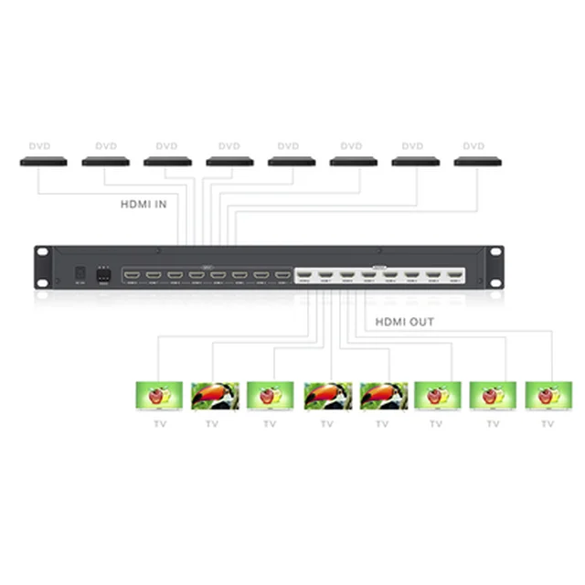 - Soporta 8 entradas de señal HDMI y 8 salidas de señal HDMI.