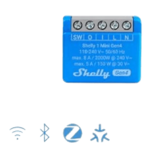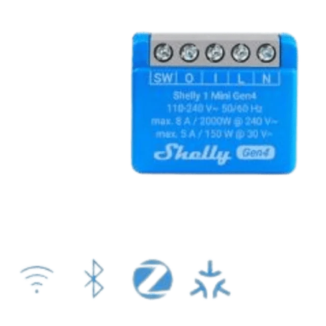 Interruptor inteligente compacto de próxima generación de Shelly para controlar luces y pequeños electrodomésticos de hasta 8 A. Equipado con chip Shelly y soporte de conectividad multiprotocolo: Wi-Fi, Zigbee, Bluetooth, Matter.