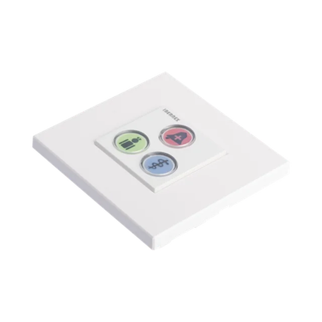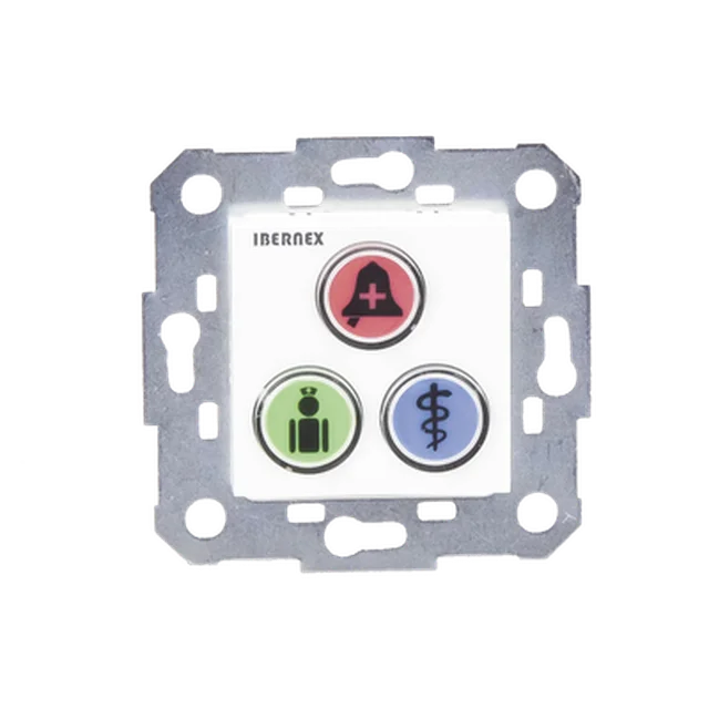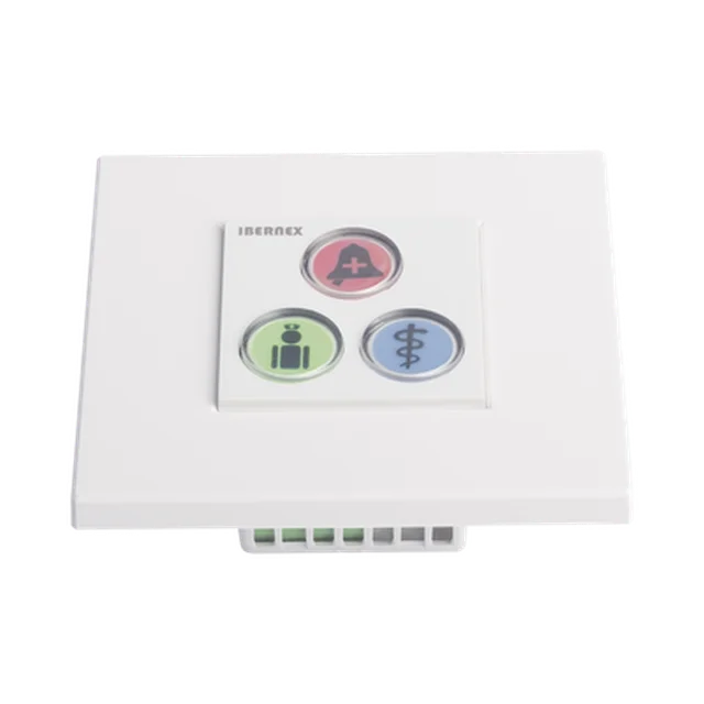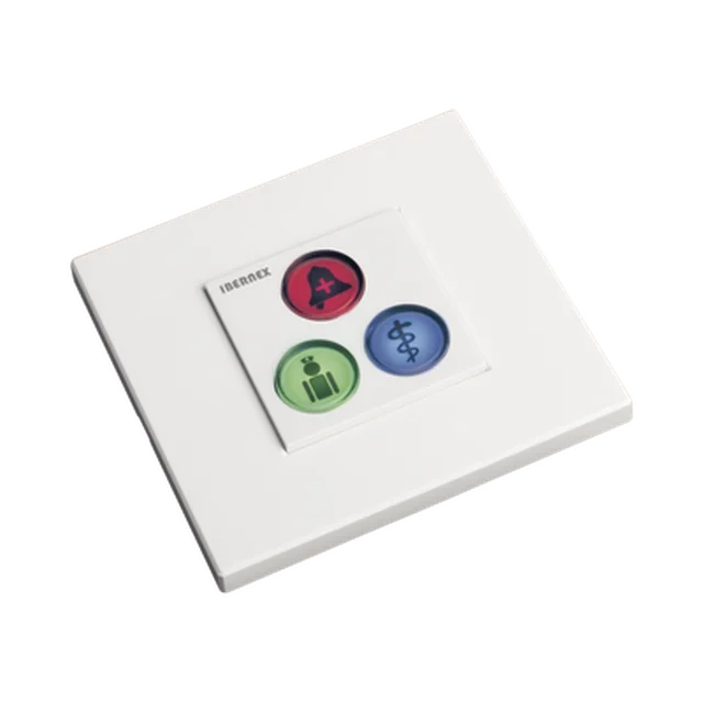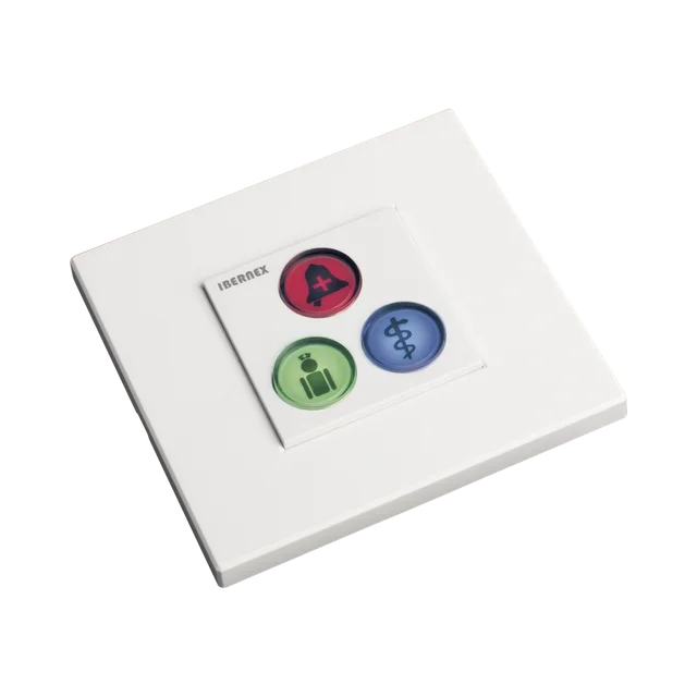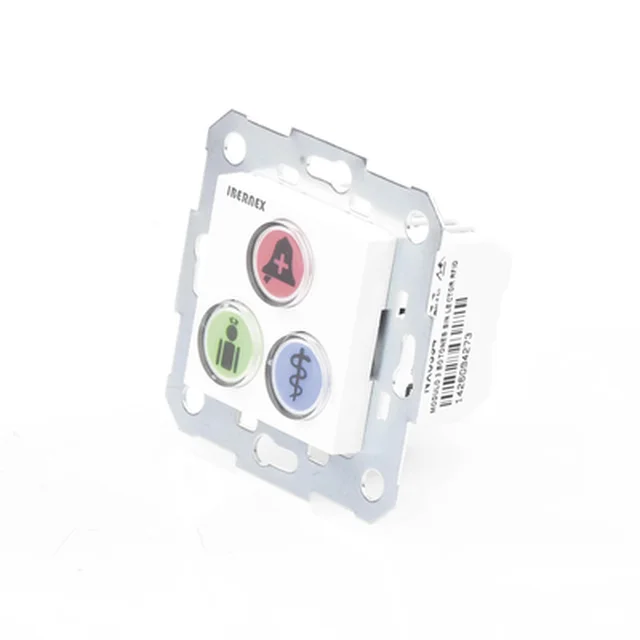El módulo de botones NX0394 es uno de los periféricos del sistema de llamadas paciente-enfermra de Ibernex. Los tres botones disponibles en el módulo se encuentran iluminados bajo configuración y permiten desencadenar llamadas de petición de ayuda, ayuda urgente y alarma médica.