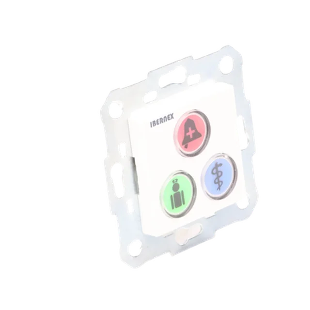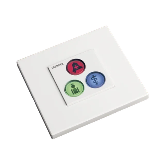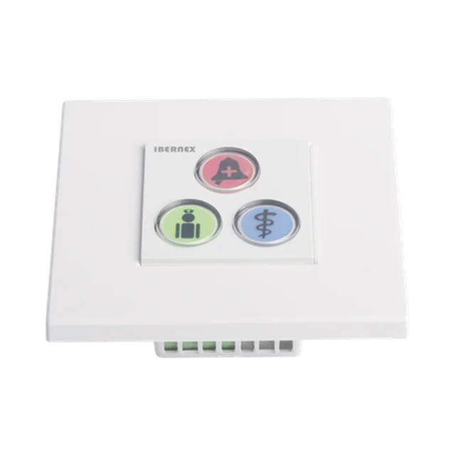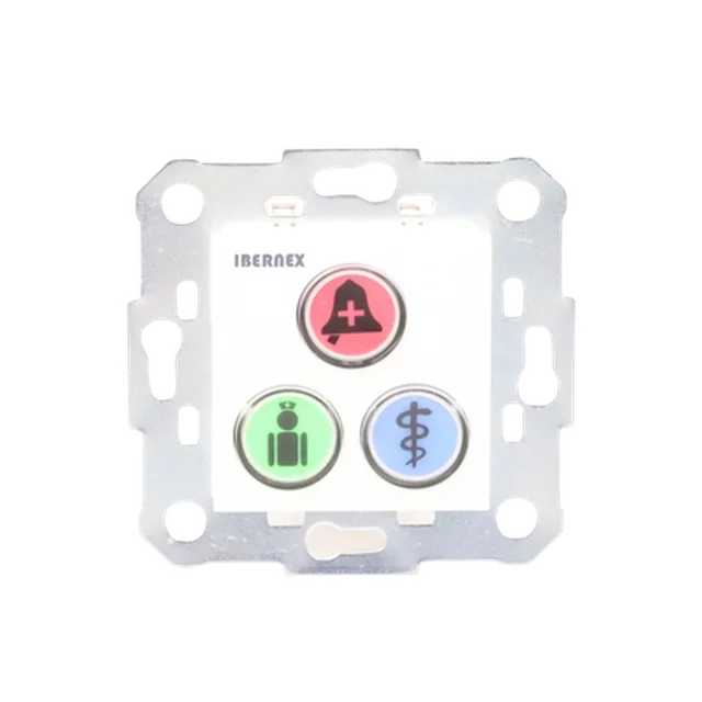 El módulo de botones NX0392 es uno de los periféricos del sistema de llamadas paciente-enfermra de Ibernex. Los tres botones disponibles en el módulo se encuentran iluminados bajo configuración y permiten desencadenar llamadas de petición de ayuda, ayuda urgente y alarma médica.