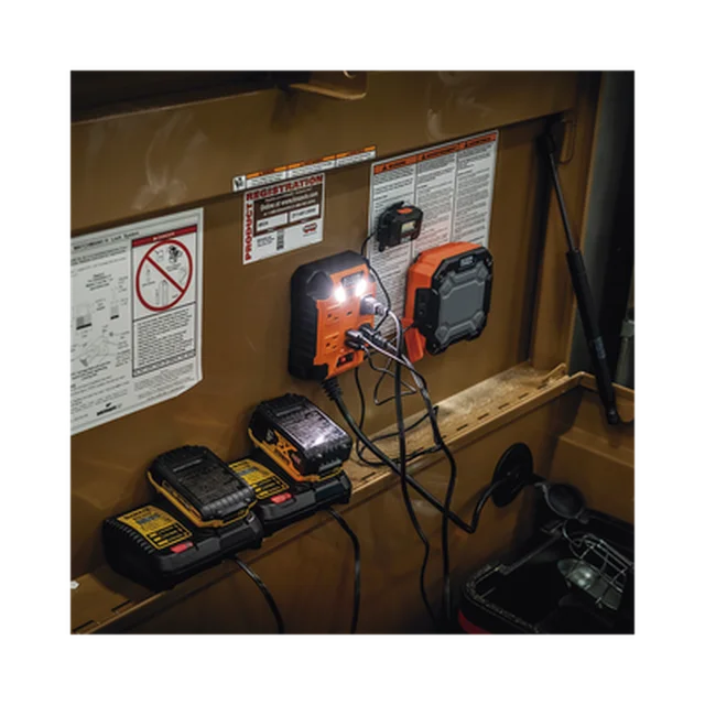 - Luces LED integradas que iluminan cualquier caja de trabajo para encontrar herramientas, baterías y cables almacenados