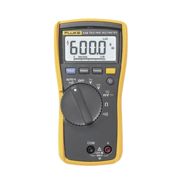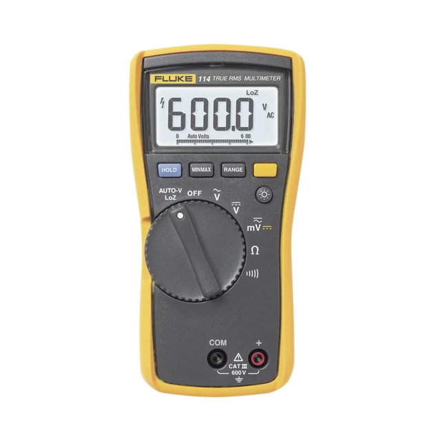 El Fluke 114 realiza lecturas de voltaje y corriente de valor eficaz verdadero con una resolución de 6.000 recuentos, y mide frecuencia, continuidad y resistencia. El sistema de retroiluminación de pantalla blanca resulta muy útil para trabajar en lugares poco iluminados. Gracias a su puerta de acceso trasera, fácil de abrir, resulta muy cómodo cambiar la batería.
