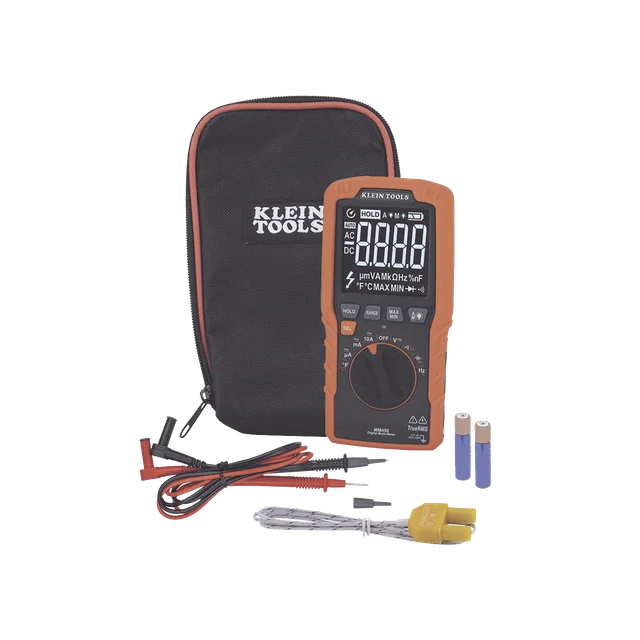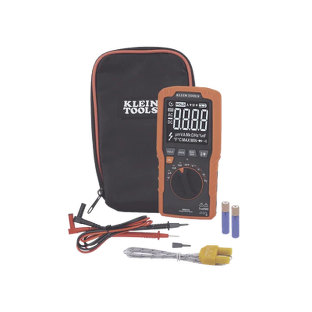 - Incluye una bolsa de transporte, cables de prueba con clasificación de seguridad CAT III 1000 V/CAT IV 600 V, termopar con adaptador y 2 baterías AAA