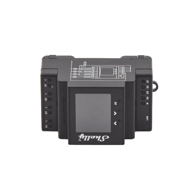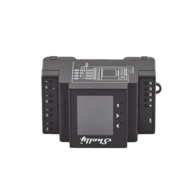 Relay profesional de 4 canales con conexión Wi-Fi, LAN y Bluetooth, apto para domótica e instalaciones con control remoto y gestión precisa de la energía. Montable en riel DIN dentro de una caja de interruptores. Funciones de seguridad mejoradas y compatible con las plataformas de domótica más utilizadas
