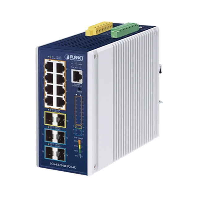 Switch Industrial Capa 3 de 8 Puertos 10/100/1000T PoE 802.3bt, 2 Puertos SFP 1 G/2.5 G, 4 Puertos SFP 10G, Instalación en Pared o Puerto DIN.