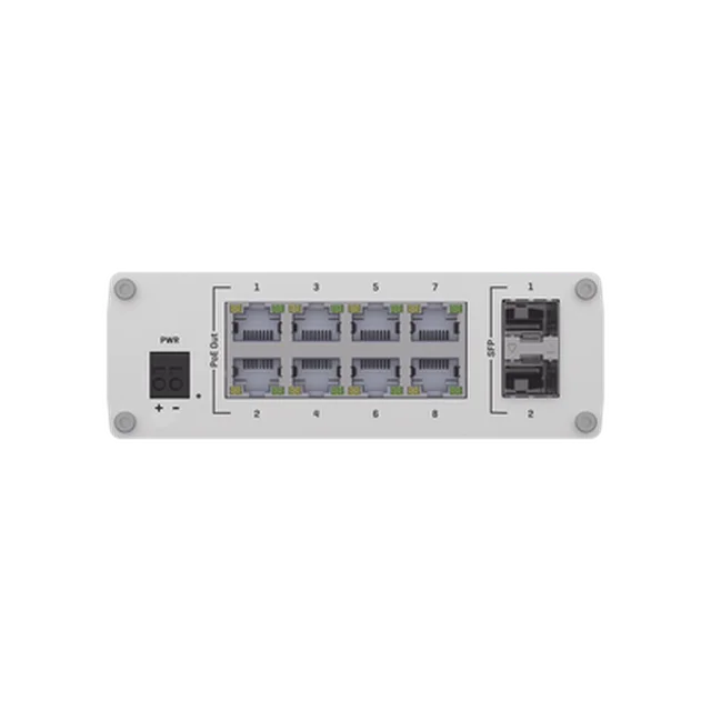 TSW200 está equipado con 2 puertos SFP para comunicación de fibra óptica de largo alcance y 8 puertos Gigabit Ethernet compatibles con los estándares IEEE802.3af e IEE802.3at Power-over-Ethernet.