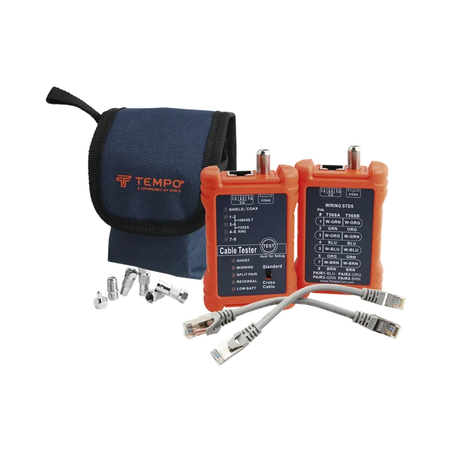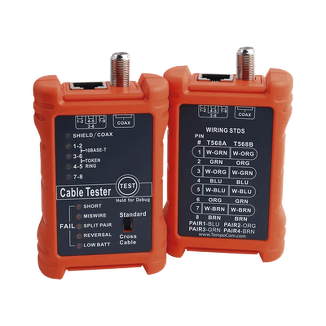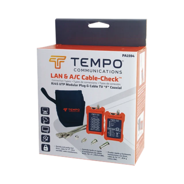Pruebe la continuidad de los cables de conexión coaxiales y LAN de 8 hilos (RJ45) y los tramos de cables instalados con el Tester PA1594 de Tempo. El PA1594 mapea el cable, línea por línea e identifica buenas conexiones, aperturas, cortocircuitos, divisiones y cruces.