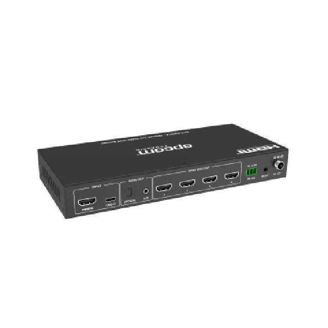 El controlador de videowall 1×4 de 18Gbps está diseñado para capturar, convertir (AD), enrutar y distribuir señales de todos los formatos a la videowall (pantallas LCD), manteniendo una transmisión de señal digital auténtica. Ofrece entrada HDMI y USB-C con una resolución de hasta 4K@60 4:4:4 y 4 salidas HDMI. Admitir multiples modos de videowall para configurar la salida de vídeo. Además, también es compatible con salidas de audio óptico y analógico L/R extraídos. Puede controlarse mediante botones en el panel frontal, control remoto IR y comandos RS-232
